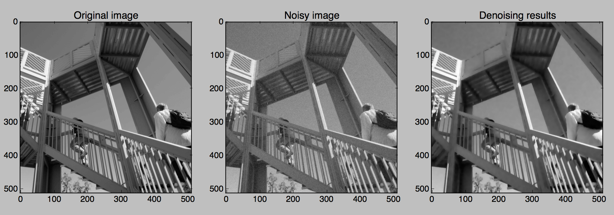For example, the following code denoises an image using simple sparse gradient and nonnegativity priors: